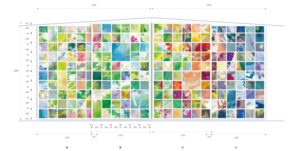 全幅6.5メートル、高さ2.8メートルの作品は、4枚のロールスクリーンで構成され、森の四季の移ろいをひとつの空間として表現しています。