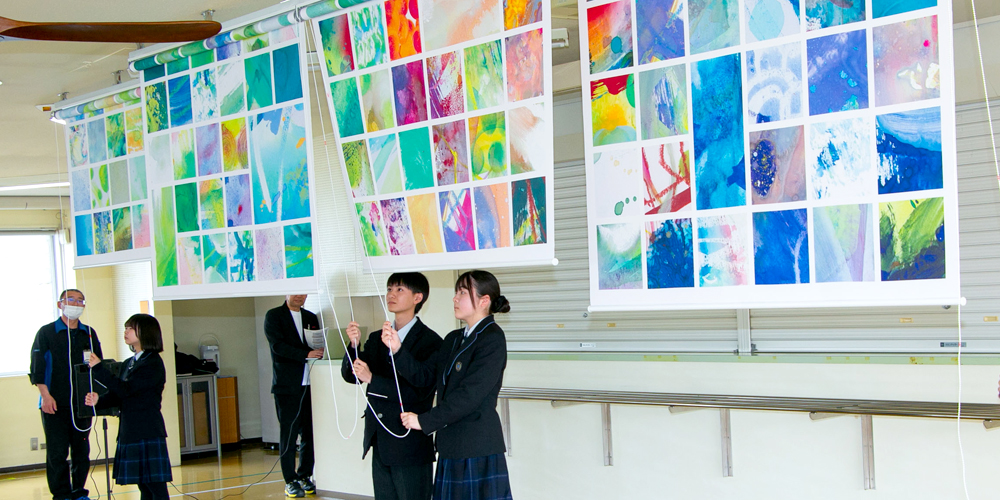 制作は、生徒が1年次の美術授業で描いた抽象画をもとにスタートしました。