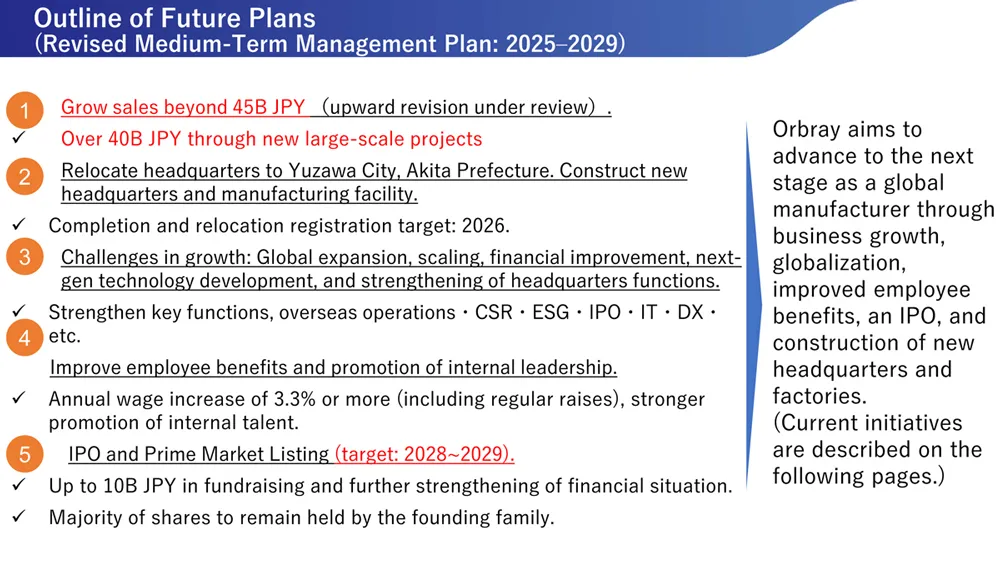 The updated plan will outline a comprehensive set of initiatives aimed at achieving annual consolidated net sales of over 45 billion yen. Key measures include accelerating global expansion, strengthening the corporate structure in line with Orbray’s growth into a larger organization, reinforcing its financial base, advancing next-generation technologies, enhancing headquarters functions, improving employee compensation, expanding recruitment, promoting leadership from within, and developing stronger personnel support systems. Through these efforts, Orbray aims to establish a sustainable and resilient operating foundation.